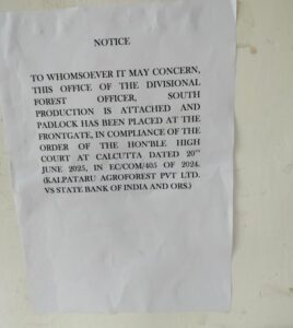 बालाघाट ११ जुलाई ;अभी तक ; गत २० साल पुराने मामले में उच्च न्यायालय कलकत्ता के २० जून २०२५ को हुये आदेशानुसार बालाघाट जिला मुख्यालय में स्थित दक्षिण उत्पादन व मुख्य वन संरक्षक कार्यालय में ११ जुलाई को तालाबंदी की कार्यवाही कर नोटिस चस्पा किया गया है। उक्त कार्यवाही के बाद वन विभाग कार्यालय में हडक़म्प मच गया।